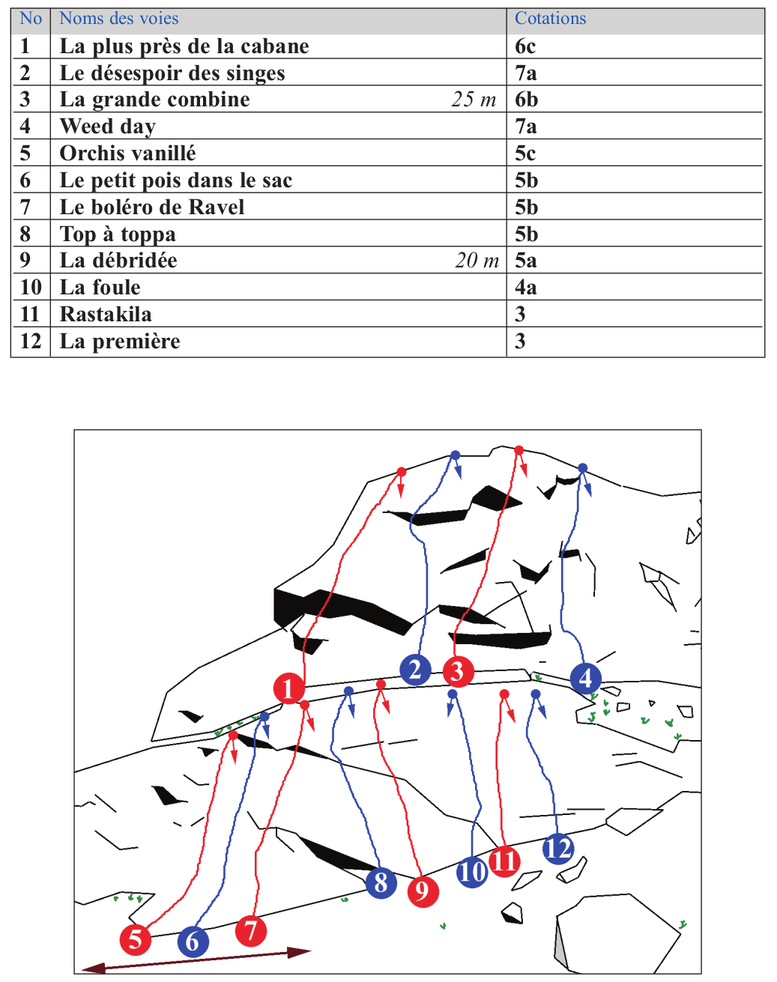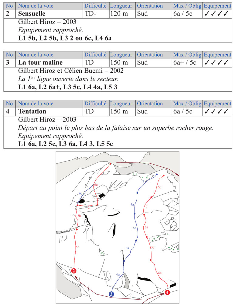 De informatie hier en op de beelden hieronder staan ook op de website van de hut, en de topos komen uit het boek "Entremont Escalades" van Olivier Roduit.