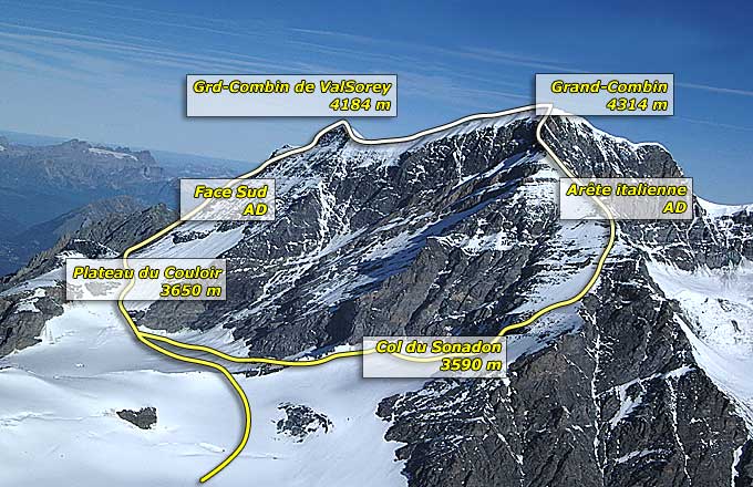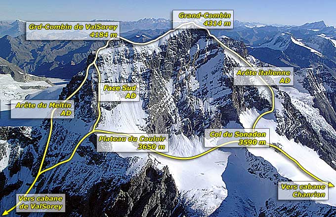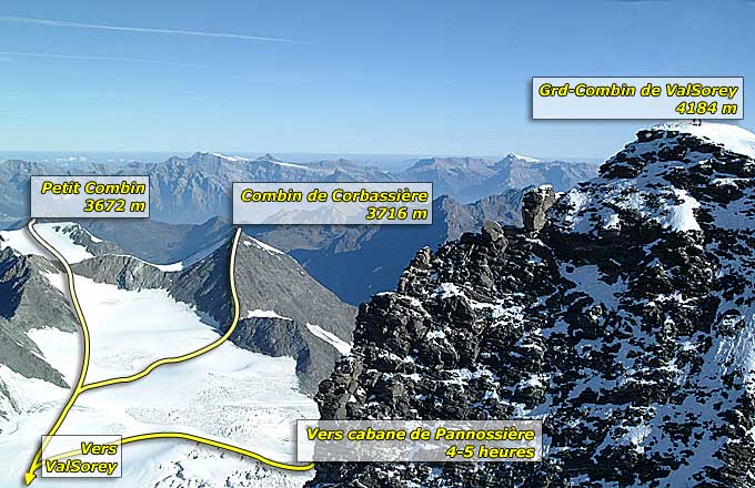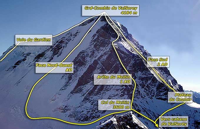 Neem vanaf Bourg Saint Pierre op 1632 m het pad dat aan de rechterkant door de dal van Valsorey voert. Na het passeren van de rotsachtige bergkam aan de linkerkant leidt naar een traverse naar de alluviale vlakte onder de Chalet d'Amont. Ga nu verder zuidwaarts over deze vlakte en vervolgens gaat u linksaf door de diepe kloof van de Torrent de Valsorey naar Les Grands Plans. Als de sneeuwcondities in de kloof deze route niet toelaten, is het mogelijk om Les Grands Plans te bereiken door schuin links langs de rotsen boven de kloof te klimmen. Vanaf hier vervolgt u de brede, lange helling richting het noordoosten, die steeds steiler wordt, waarbij u P 2614 aan uw linkerhand laat. Bovenaan houdt u links (West) aan de om de hut te bereiken.